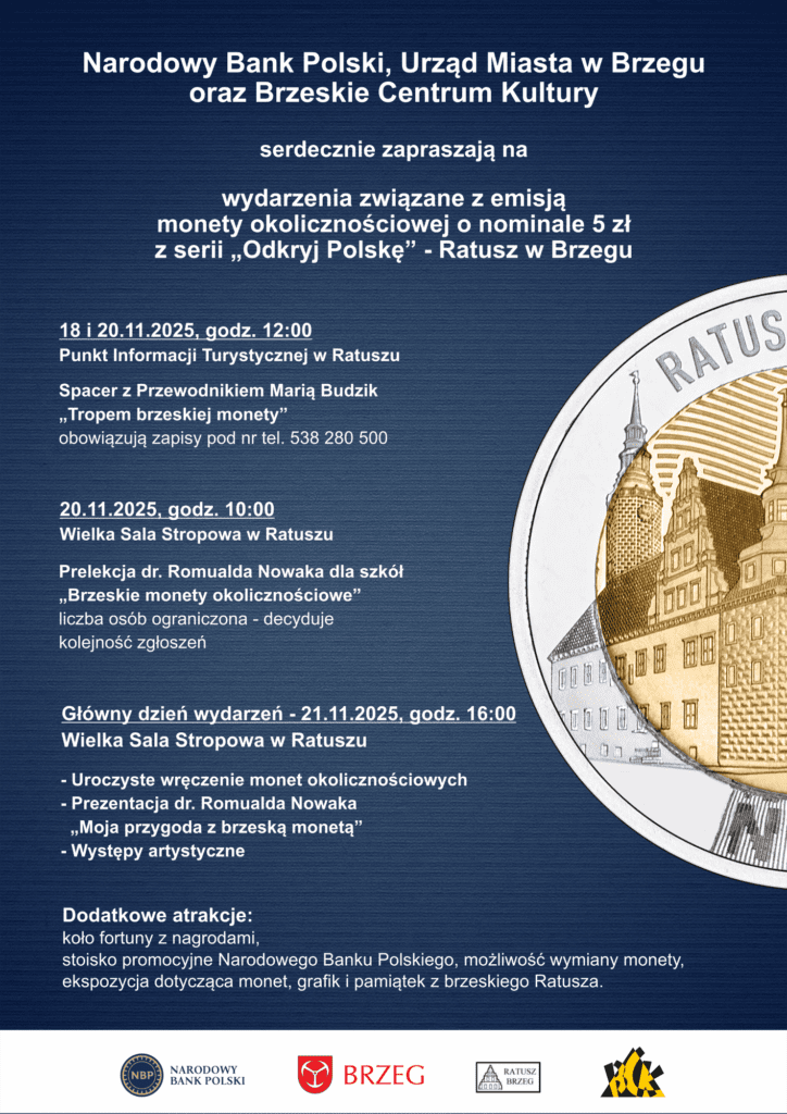 Z okazji premiery monety Narodowy Bank Polski, Urząd Miasta w Brzegu i Brzeskie Centrum Kultury zapraszają mieszkańców i miłośników historii na wydarzenia kulturalno-edukacyjne: